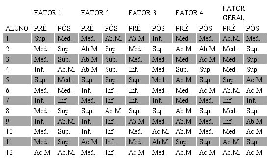 Verificando-se os resultados obtidos por meio de escores e convertidos em percentis pelos alunos com AH/SD (Alunos 1, 3, 5, 7, 9 e 11), nota-se que no Fator 1, dois alunos tiveram escores mais altos no pós-teste, três mais baixos e um se manteve o mesmo. Nos Fatores 2 e 3, dois participantes apresentaram aumento, três redução e dois mantiveram o mesmo. No fator 4, três alunos apresentaram aumento, nenhum teve diminuição e três se mantiveram iguais. Em relação ao grupo de alunos sem AH/SD (composto pelos Alunos 2, 4, 6, 8, 10 e 12), nota-se que no Fator 1 quatro alunos apresentaram melhora e dois se mantiveram os mesmos, no Fator 2, dois alunos apresentaram aumento, dois diminuição e dois se mantiveram iguais, no Fator 3, cinco apresentaram maiores percentis e um se manteve o mesmo e, no Fator 4, três alunos apresentaram progresso, um diminuiu seu percentil e 2 mantiveram os mesmos resultados.