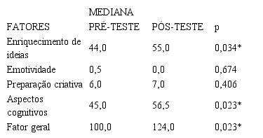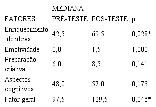 Por meio da Tabela 2, observa-se que dentre os 5 fatores avaliados pelo teste, quatro apresentaram resultado mais elevado no pós-teste, sendo 3 deles com significância estatística (Enriquecimento de ideias, Aspectos cognitivos e Fator geral). Assim, os dados demonstram que os 10 encontros de suplementação em língua inglesa foram relevantes para o desenvolvimento da criatividade do grupo, revelando que as condições proporcionadas foram capazes de transformar o potencial do grupo em diferentes aspectos (RENZULLI, 2014) e que o ambiente, os estímulos e as circunstâncias favoreceram a expressão criativa dos participantes (ALENCAR, 2015).