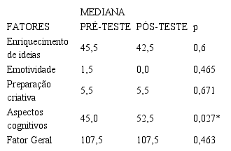 A partir da comparação entre pré e pós-teste, nota-se aumento de todos os fatores neste grupo, com dois deles apresentado significância estatística, Enriquecimento de ideias e Fator geral (calculado a partir dos demais). Observa-se, assim, que o grupo de alunos sem AH/SD beneficiou-se mais que o primeiro, confirmando os ganhos apresentados nos Gráficos 1 e 2.