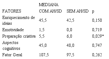 Analisando os dados apresentados na Tabela 5, a média geral dos escores do grupo com AH/SD foi maior do que do outro grupo em três fatores (Enriquecimento de ideias, Emotividade e Fator Geral), sem apresentar significância estatística. Dois fatores se mostraram mais elevados no pós-teste do grupo sem AH/SD, Preparação criativa (com significância estatística) e Aspectos cognitivos (sem significância estatística), novamente ressaltando que o trabalho de suplementação com língua inglesa desenvolveu aspectos criativos diversos nos dois grupos.