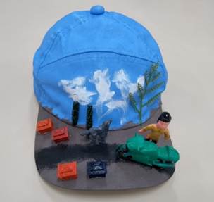 Em relação à pintura dos objetos e do boné, KSL (16 anos) conseguiu pintá-los com um adaptador bucal, pois a sua deficiência o impede de ter autocontrole de braços e mãos. Apesar disso, teve iniciativa e autonomia ao escolher as cores azul, cinza, branca e preta para compor seu cenário. Misturamos as cores preta e branca até conseguirmos a tonalidade da cor cinza, conforme imaginou. Sendo assim, usou a cor azul para representar o céu, a cor branca ao dar pinceladas para fazer a representação das nuvens e a cor preta para representar uma via, a qual simboliza o trajeto de viagem da sua personagem.