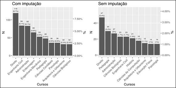Entre os dez cursos com maior número de matrículas de estudantes com TEA, destaca-se o curso de Direito com 3,4% (n=47, sem imputação) e 8,7% (n=119, com imputação), conforme apresentado na Figura 1.