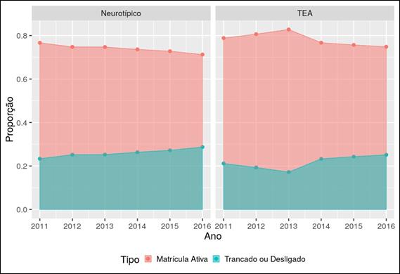 Verifica-se, na Figura 2, a proporção de matrículas ativas (em vermelho) e inativas (em azul) para os estudantes neurotípicos e com TEA, sendo que entre 2011 e 2016 a proporção de matrículas ativas reduziu lentamente entre os estudantes neurotípicos, passando de 78% a 71%. Observa-se que entre os estudantes com TEA esse padrão não se repete e, via de regra, o número de matrículas ativas entre estudantes com essa condição é sempre maior, chegando a 82% em 2013, por exemplo.