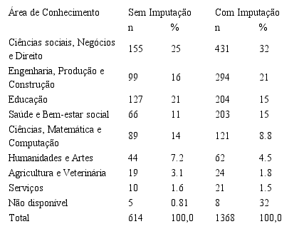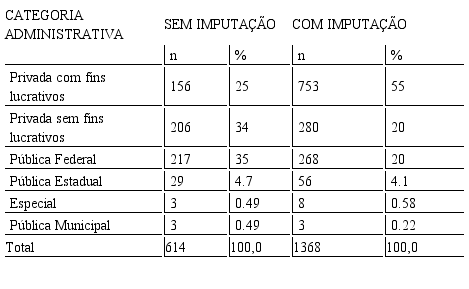 Em relação à categoria administrativa das IES, a maioria (59%, n=362, sem imputação; 75%, n=1.033, com imputação) se refere a matrículas em IES privadas, sendo que somente 35% (n=217) sem imputação e 20% (n=268) com imputação frequentam o ensino público federal, conforme apresentado na Tabela 1. O INEP incluiu, em seus dados, também, a categoria “Especial”. Essa categoria, de acordo o item 2.3 do anexo da Portaria Normativa/MEC nº 23, de 01 de 2010, refere-se a uma “instituição educacional oficial criada por lei estadual ou municipal e existente na data da promulgação da Constituição Federal, que não seja total ou preponderantemente mantida com recursos públicos, portanto não gratuita” (BRASIL, 2010, s.p.).