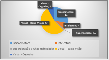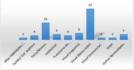 Em 2018, conforme demonstrado no Gráfico 5 abaixo, 54% dos alunos que demandavam apoio do NAPE possuíam deficiência visual, 28% deficiência físico-motora e 8% deficiência intelectual, enquanto apenas 2% tinham Superdotação/Altas habilidades. Não existem registros de demanda de atendimento para surdos em 2018, assim como nos anos anteriores. Em 2019/1, contudo, conforme demonstrado no Gráfico 6 abaixo, surgem demandas tanto de apoio para surdos (2) bem como para deficientes auditivos (2): no primeiro caso, intérpretes de Libras/Língua Portuguesa e, no segundo caso, tecnologias para amplificação de voz.