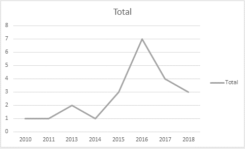 Com relação à periodicidade, observamos o crescimento das produções entre os anos de 2014 e 2016. O aumento de tais produções pode estar relacionado à crescente visibilidade do TEA, oriunda de movimentos sociais e destaques na mídia (ORTEGA, 2008), de fatores de ordem política como a publicação da lei Berenice Piana (BRASIL, 2012) e a atribuição do status de deficiência ao autismo, da Lei Brasileira de Inclusão, em 2015 e dos processos de implementação da Política Nacional de Educação Especial na Perspectiva de Educação Inclusiva desde 2008. Nesta pesquisa não identificamos trabalhos anteriores a 2010, o que se deve, possivelmente às restrições da própria base de dados e dos descritores utilizados, já que outros estudos de revisão, como o de Neves et al. (2014), evidenciam a existência de pesquisas sobre inclusão escolar de pessoas com TEA já na década de 1990. Do mesmo modo, a queda observada em 2018 pode estar relacionada ao período definido para o levantamento da literatura, finalizado em setembro de 2018.