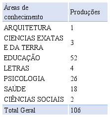 A produção do corpus da pesquisa baseou-se nos seguintes critérios: (a) defesa realizada em Programas de Pós-graduação em Educação e; (b) presença de termos relacionados à educação inclusiva em seus títulos ou palavras-chave. Com o propósito de identificar as pesquisas em educação, agrupamos as produções em diferentes áreas de conhecimento, com base nos Programas de Pós-Graduação de origem. A tabela 1 apresenta a distribuição das pesquisas encontradas, por área de conhecimento: