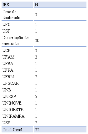 Dos 52 trabalhos produzidos em PPGs da área de educação (Educação, Educação especial, Gestão e Políticas Públicas, Educação para a Ciência, Educação Escolar, Mestrado Profissional em Educação, Docência para a Educação Básica), selecionamos apenas aqueles que tivessem nos títulos ou nas palavras-chave termos relacionados à educação inclusiva, a saber: inclusão escolar, inclusão educacional, escolarização, educação inclusiva, inclusão. Excluímos os trabalhos referentes à cognição, desenvolvimento físico e motor, comunicação alternativa e tecnologias alternativas, família e saúde. Obtivemos, assim, o corpus da pesquisa composto por 22 produções.
