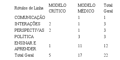 As explicações sobre o autismo apresentadas nas 22 produções foram categorizadas em dois modelos distintos: o modelo médico e o modelo crítico. No modelo médico, foram incluídos os trabalhos cujas explicações fundamentaram-se nos manuais psiquiátricos (DSM IV, DSM 5 e Classificação Internacional de Doenças - CID 10), centrados na definição do autismo como déficit ou transtorno e na tríade ou na díade dificuldades2 relacionadas à comunicação, às habilidades sociais e ao desenvolvimento intelectual. No modelo crítico, por sua vez, inserem-se os trabalhos que problematizaram a perspectiva biomédica e buscaram outros modelos explicativos, alternativos ao modelo dominante.