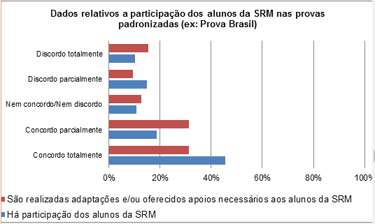 As respostas dos professores revelaram que a maioria dos alunos PAEE participa de provas padronizadas, mais de 70%. Também se pode constatar que na maioria das realidades alcançadas a partir dos resultados são realizadas adaptações ou apoios necessários nas provas padronizadas para os alunos PAEE (62,5%). Esses resultados não coincidem com o que foi exposto pelos professores durante a realização de grupos focais de outros estudos realizados, onde há diversos relatos que de os alunos PAEE não participam das provas padronizadas, sendo convidados a não irem para a escola no dia da aplicação da mesma e que raramente são feitas adaptações (PASIAN; VELTRONE; CAETANO, 2012; SILVA; MELETTI, 2012; TARTUCI et al. , 2014).