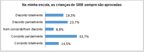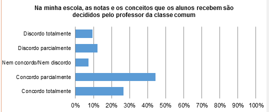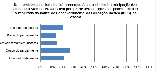 Outra questão é demonstrada na Figura 10 diretamente ligada ao que foi discutido anteriormente sobre a temática da participação dos alunos PAEE nas provas padronizadas pelos professores da SRM na Prova Brasil, referente a acreditar que eles podem abaixar o resultado do índice de Desenvolvimento da Educação Básica (IDEB) na escola.