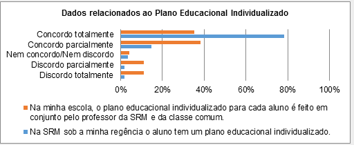 Torna-se importante destacar que a família apareceu fortemente como participativa no processo de avaliação e decisão do encaminhamento para a SRM. A maioria dos professores apontou que realizam um PEI para os alunos e que entregam relatórios bimestrais, semestrais e anuais. Esses dados são positivos e vêm de encontro com a proposta da SRM para um bom acompanhamento do AEE.