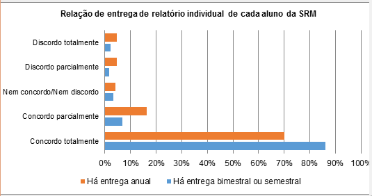 Na Figura 14 questionou-se quanto à elaboração de um relatório individual para cada aluno da SRM, tanto bimestral ou semestral quanto anualmente. Há grande concordância entre os professores que ocorre uma entrega bimestral ou semestral de um relatório individual do aluno PAEE (92,9%) e também quanto à entrega de um relatório anual (86,6%). Tal dado é importante uma vez que este relatório permite ao professor ter consciência da evolução de seu aluno e, com isso, realizar o planejamento da melhor forma possível. Também possibilita que o professor da sala regular tenha acesso ao desenvolvimento do aluno e, com isso, facilitar o trabalho de outros educadores ou de atendimento em outro ambiente.