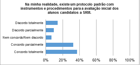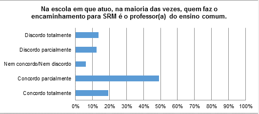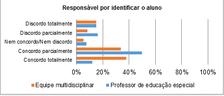 Na Figura 2 observa-se que a maioria dos participantes declara que o professor da educação especial é o responsável por identificar o aluno a ser atendido na SRM, no entanto, concorda parcialmente foi a resposta mais escolhida. Pode-se inferir, através desse resultado, que o professor de educação especial participa da notificação, porém não é o único responsável. Parece haver uma contradição, sendo que 71,5% dos professores responderam que, em sua realidade, uma equipe multidisciplinar é responsável por identificar e encaminhar o aluno, de forma mais expressiva pode ser observado que 37,9% dos professores concordaram totalmente. Com isso, tem-se fortalecida a suposição de que o professor de educação especial participa da identificação, porém não é o único que a realiza.