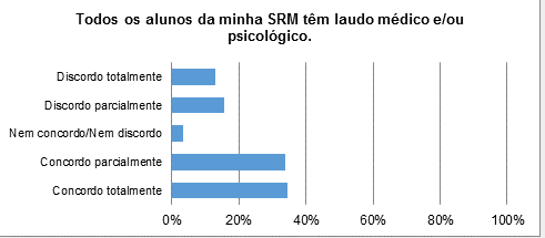 É preciso refletir se o diagnóstico está auxiliando ou dificultando o processo de educação inclusiva. O trabalho de Tartuci et al.(2014) relata que muitas vezes o diagnóstico é realizado e o aluno não é atendido, sendo que é necessário a obtenção de um laudo médico e vários percalços ocorrem até sua obtenção. Isso revela atraso e dificuldades para o atendimento do aluno PAEE na SRM, o que dificulta e atrapalha dessa forma, favorecer a inclusão escolar. Essa discussão é recorrente também com o assunto abordado na Figura 3, que relata sobre a existência ou não de laudo para os alunos frequentarem o AEE nas diferentes regiões brasileiras.