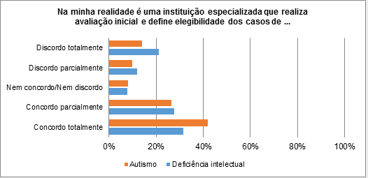Constata-se que na maioria dos casos é uma instituição especializada que realiza a avaliação e fornece o diagnóstico de autismo (68,3%) e deficiência intelectual (59,3%). Pode-se inferir com isso que a gestão da escola e os professores não possuem formação para fornecer os laudos e também que falta uma equipe multidisciplinar para realizar o diagnóstico, o que remete a necessidade de instituições de fora da escola para lidar com a demanda para diagnosticar os alunos (ANACHE; RESENDE, 2016; PASIAN; MENDES; CIA, 2017 b; VELTRONE; MENDES, 2011)
