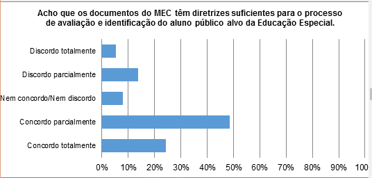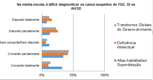 Isso revela uma contradição entre as respostas e nos faz pensar como hipótese se o professor tem receio de colocar sua verdadeira opinião discordando dos documentos oficiais. Como pode haver diretrizes suficientes e ao mesmo tempo ser difícil de diagnosticar? Ou ser necessário destinar muitos casos a instituições especializadas para avaliação e laudo? Tal questão contraditória demanda extensa discussão quanto à formação desses docentes e a necessidade de se repensá-la, assim como prover subsídios para apoiar essa formação (PASIAN; MENDES; CIA, 2017b; PRIETO; MANTOAN; ARANTES, 2006; VIEIRA, 2008)