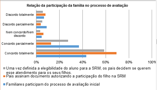 Esses dados corroboram as diretrizes nos documentos oficiais, os quais destacam a importância de uma avaliação global que envolva a análise de variáveis presentes na instituição escolar, a ação pedagógica e a família (BRASIL, 2008). A participação da família é de grande importância no processo de avaliação e encaminhamento para o AEE e a parceria dos pais/responsáveis com a escola auxilia o trabalho desenvolvido no processo de inclusão escolar (CONCEIÇÃO et al., 2014; PASIAN; MENDES; CIA, 2017a; SILVA; MENDES, 2008).