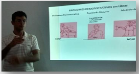 Morato e suas colaboradoras (2014) trazem para a academia científica a história de um professor surdo que ministra aulas de Libras para estudantes, no Curso Superior, e consegue promover a inclusão de ouvintes e sua própria inclusão na Educação Superior. Para isso, o professor consulta materiais didáticos, cria suas próprias apostilas de Libras, adaptando outros materiais já existentes, bem como faz uso de diversos recursos tecnológicos, conforme se pode observar nas imagens 1 e 2.