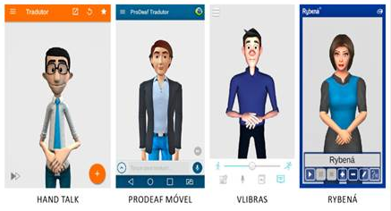 Destacamos, ademais, o Hand Talk6, o ProDeaf7 e o Rybená8. O Hand Talk realiza a tradução digital e automática para a Língua de Sinais, utilizando um intérprete virtual 3D. O ProDeaf e o Rybená traduzem texto e voz de português para Libras e, além de traduzir, permitem criar e compartilhar sinais em Libras, dentre outros.