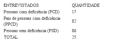Entre os entrevistados, encontram-se 17 pessoas com deficiência (PCD), sendo quatro cegos1, dois surdos2, um surdocego3, dois com paralisia cerebral4, dois com síndrome de down5, seis deficientes físicos6; dois pais de pessoas com deficiência7 (PPCD); e seis pessoas sem deficiência envolvidas com a temática8 (PSD).