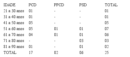 Quanto à idade, tomou-se como referência o momento da entrevista, tendo, assim, uma variação entre 27 e 90 anos de idade.