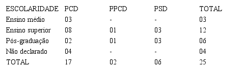 A caracterização dos entrevistados destacou as seguintes categorias: distribuição por tipos de deficiência ou sem deficiência; nível de escolarização; e ano em que iniciou a militância ou as ações relacionadas ao tema, conforme organizados nas tabelas abaixo.