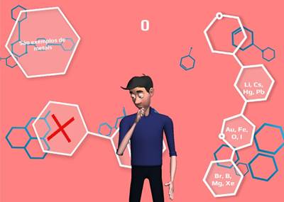 No exemplo mostrado, o objetivo é que o aluno identifique os elementos classificados como metais, deslocando o grupo correspondente até a figura da “mãozinha”, por meio da tecnologia touchscreen. Adicionalmente, o aluno é estimulado a ter familiaridade com a representação simbólica dos elementos químicos.