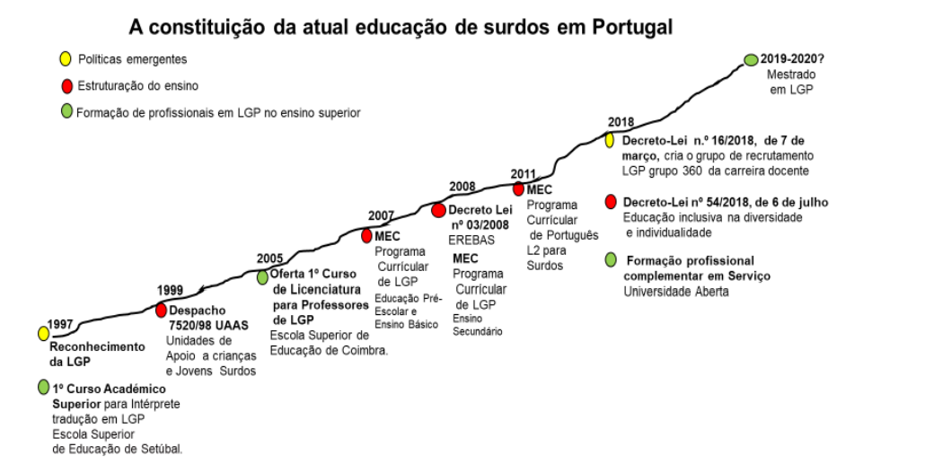 Percebe-se, pela análise da imagem 1, que a oficialização do reconhecimento da LGP em 1997, conduziu à estruturação do campo do ensino e da formação de profissionais. A formação de profissionais intérpretes surge primeiro, e só depois é que se estrutura a formação de professores em LGP no ensino superior. Assim, a organização do ensino foi iniciada oficialmente no Despacho nº 7520 de 1998 que cria as Unidades de Apoio a Alunos Surdos (UAAS) como princípio de projeto bilingue (PORTUGAL, 1998), e posteriormente, surgiram os Programas Curriculares de LGP na Educação Pré-Escolar e Ensino Básico (PORTUGAL, 2007) e no Ensino Secundário (PORTUGAL, 2008), como primeira L1.