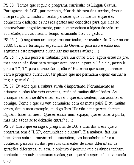 Nas suas aulas, os docentes surdos, baseiam o ensino da língua no currículo de LGP nos seus diferentes níveis, procurando atender à realidade, mas adaptando-o. Um currículo flexível é constituído nas suas atividades, de modo a atender as situações das aulas, tratando-se, portanto, de um currículo mais abrangente ao fundamentar o trabalho dos professores às necessidades dos estudantes nas suas aprendizagens.