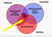 Na figura acima, a “capacidade acima da média” representa o domínio superior do potencial em alguma área, que pode ser geral, quando representa a grande capacidade de processamento de informação, ou específica, quando manifesta capacidade de adquirir conceitos, técnicas, práticas ou habilidades em uma área específica (VIRGOLIM 2014). O “envolvimento com a tarefa” enfatiza a parte motivacional e a energia direcionada na resolução dos problemas ou tarefas de forma perseverante, com dedicação, esforço e autoconfiança (VIRGOLIM, 2007). Já a “criatividade” diz respeito à originalidade e à utilidade, envolvendo aspectos relacionados à fluência, flexibilidade e originalidade de pensamento, curiosidade, sensibilidade e coragem de arriscar (VIRGOLIM, 2014). Vale ressaltar que essas três características não necessitam se manifestar com a mesma intensidade ou estar presentes ao mesmo tempo em todas as situações, porém a interação dos três traços proporciona a habilidade superior.