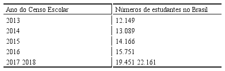 Para melhor expor os dados referentes aos índices de estudantes com Altas Habilidades/Superdotação no Brasil, a tabela abaixo exibe um comparativo dos últimos seis anos, mediante dados obtidos pelo Censo Escolar de 2013 a 2018 (INEP, 2019). Estes dados estão relacionados apenas a estudantes matriculados na educação básica, não sendo computado o percentual de outras áreas ou demandas.