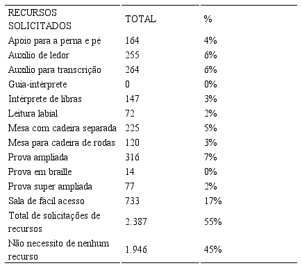 Preveem-se diferentes recursos a serem disponibilizados como atendimento especializado para a aplicação das provas: