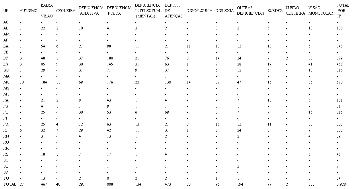 Na segunda aplicação do ENEM, realizada em 2016, predomina a solicitação de recursos para pessoas com deficiência física, seguido de déficit de atenção, baixa visão, visão monocular, deficiência auditiva e outras deficiências. A deficiência intelectual (mental) vem em seguida (134 solicitações), o que não corresponde ao conjunto dos alunos público alvo da educação especial matriculados na educação básica, cuja categoria majoritária é a deficiência intelectual (mental) (REBELO, 2016). Em 2017, o Censo Escolar aponta que do total de 1.066.446 matrículas de alunos público alvo da educação especial, 732.185 eram matrículas de alunos com deficiência intelectual (INEP, 2017b). Os estados com maior solicitação de atendimento especializado por deficiência são Minas Gerais, Espírito Santo e Distrito Federal.