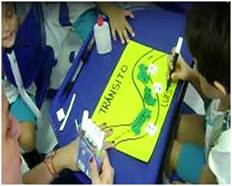 As figuras 9 e 10 apontam avanços no desenvolvimento do desenho de João. Especificamente, na atividade da figura 9 ele não só estruturou seu esquema corporal (objetivo 8 da escrita), como também representou o sol e o chão a partir de um modelo desenvolvido pela professora. Na tarefa da figura 10, João deu continuidade ao desenho sobre o trânsito, iniciado pela professora (objetivo 9 da escrita).