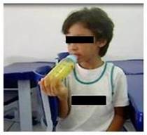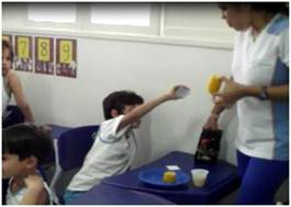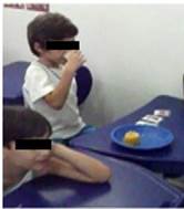Na situação de lanche, era observado que João não se comunicava para solicitar seus alimentos. Em geral, eles eram prontamente entregues ou dados pelas professoras. Vale, ainda, ressaltar que o aluno utilizava uma mamadeira e, diferente dos colegas, não consumia os alimentos da escola, conforme observado na figura 2.