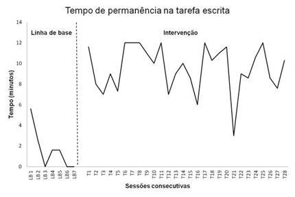 Em termos quantitativos, um delineamento de pesquisa quase-experimental intrassujeito foi utilizado para avaliar os efeitos do PEI no nível de participação do aluno nas rotinas foco da intervenção. Assim, foi contabilizado o tempo que João permaneceu realizando cada tarefa durante a linha de base e, posteriormente, na intervenção, após implementado o PEI. Na tarefa de escrita, os seguintes dados (Figura 13) foram produzidos: