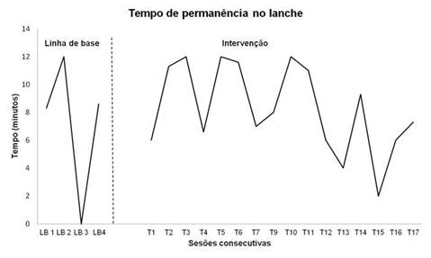Na linha de base, as professoras (titular e auxiliar) foram instruídas a interagir livremente com o aluno nas duas rotinas selecionadas (lanche e escrita). As sessões foram videografadas e as variáveis dependentes, analisadas. O critério para o término dessa fase foi a estabilidade ou tendência descendente no tempo de permanência de João na tarefa em uma das duas rotinas analisadas.
