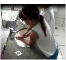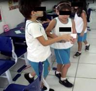 Nessas sessões foi observado o uso dos recursos da CAA durante o lanche, a substituição da mamadeira pelo copo e a ingestão de alimentos da escola. Embora não previsto nos objetivos do PEI, alguns alunos da turma começaram a utilizar os pictogramas com João. Esse comportamento é ilustrado nas figuras 15 e 16, onde uma colega mostra o cartão ao aluno e o ajuda a lavar as mãos: