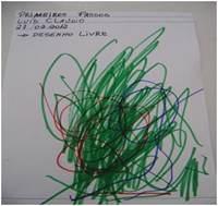 Com base em material videografado e registros de diário de campo, a pesquisadora selecionou as atividades de escrita e lanche como foco das ações interventivas. No primeiro caso, os resultados revelaram que João era tipicamente instruído a realizar atividades paralelas, não relacionadas ao desenvolvimento da escrita. Sua participação era restrita a desenhar espontaneamente. Nessas ocasiões era observado que, enquanto a turma realizava atividades variadas de escrita, a ele eram propostas tarefas de desenho livre, sem orientações ou objetivos definidos. Assim, permanecia em sua carteira realizando movimentos circulares na folha de papel, conforme observado na figura 1 a seguir.