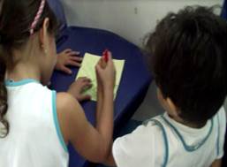 Na figura 3, os alunos brincam de massinha após intervenção da professora. Na figura 4, uma colega de turma auxilia João a fazer um registro escrito durante uma atividade cooperativa proposta pela docente.