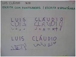 Nas atividades acima, João escreve o próprio nome e o nome da escola, utilizando a técnica das letras pontilhadas e vazadas. Vale ressaltar que sua produção aproxima-se da escrita convencional das letras.