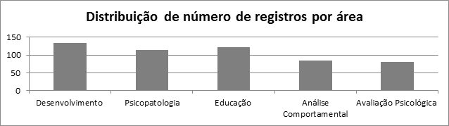 Foram contabilizados 530 registros de disciplinas capazes de contemplar a temática do TEA, agrupadas nas grandes áreas acima mencionadas, para as quais foram identificados os seguintes números: o campo do Desenvolvimento Humano contou com 133 registros (ou seja, títulos de disciplinas); o da Educação com 123 registros seguido da Psicopatologia, com 114 registros; o da Análise Comportamental, com 85 registros e logo depois, o da Avaliação Psicológica, com 80 registros. Os dados tornam-se mais claros por meio da representação gráfica a seguir (Gráfico 1).