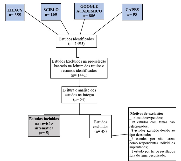 Quanto aos critérios de exclusão, foram adotados os seguintes: a) estudos de revisão, observação e ensaios; b) população não-implantada como respondente; c) estudos não encontrados para a leitura na íntegra; d) estudos repetidos; e) estudos com informações insuficientes; e f) estudos que não atendessem aos critérios de inclusão.