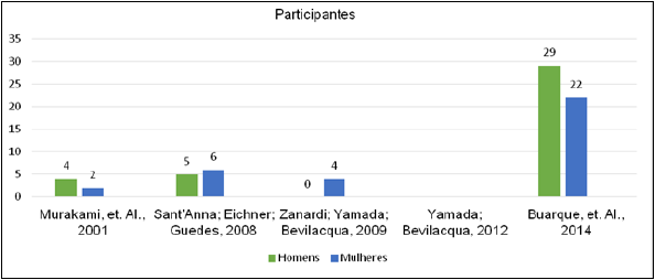 Considerando os cinco (5) estudos analisados, o total de participantes foi de 116 indivíduos, sendo 38 do sexo masculino e 34 do sexo feminino, não entrando nesta somatória os dados dos participantes do quarto estudo por este não ter especificado a quantidade de participantes de cada sexo.