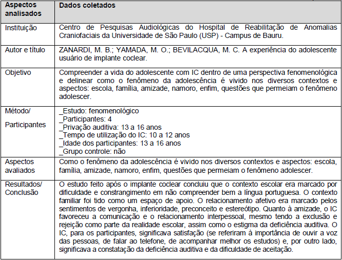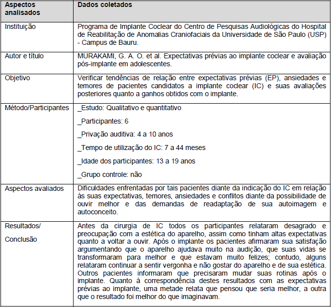 Nos Quadros 1, 2, 3, 4 e 5 são apresentadas informações retiradas dos estudos incluídos nesta revisão sistemática, a qual trata dos efeitos sociais advindos do implante coclear na vida da pessoa implantada. A seguir, será apresentada a análise e discussão concernente aos resultados levantados a partir da pesquisa.
