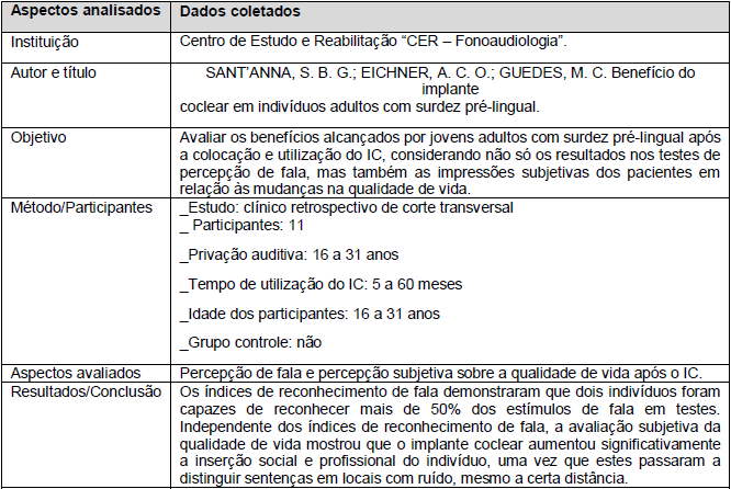 Quanto à qualidade de vida, não fica claro no texto se os dados apresentados são da pesquisa ou de outra fonte consultada. Contudo, os autores afirmam que é necessário haver o acompanhamento a longo prazo dos indivíduos, bem como desenvolver a avalição dos aspectos psicossociais menos específicos, uma vez que o estudo avaliou apenas o reconhecimento de frases e sentenças, e se o IC possibilitava uma boa inserção social no ambiente de trabalho através de questionário (SANT’ANNA; EICHNER; GUEDES, 2008).