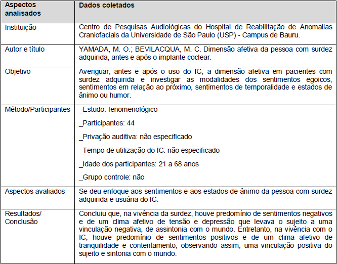 O trabalho de Yamada e Bevilacqua (2012) se empenhou em averiguar, antes e após o uso de IC, a dimensão afetiva em pacientes com surdez adquirida e investigar as modalidades dos sentimentos egóicos (ou seja, sentimentos voltados para o ego, para si), sentimentos em relação ao próximo, sentimentos de temporalidade e estados de ânimo ou humor, tendo alcançado tais objetivos.