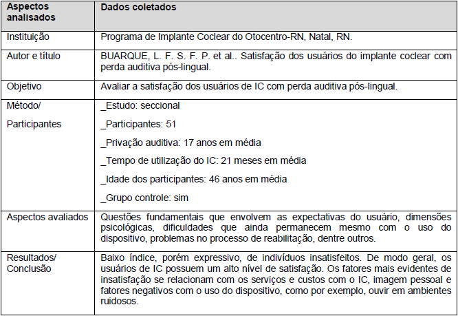 A pesquisa de Buarque et al. (2014) avaliou a satisfação dos usuários de implante coclear com perda auditiva pós-lingual, tendo atingido seus objetivos.