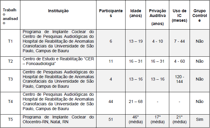 Com relação aos Participantes, os trabalhos contaram com uma variação de 4 a 51 indivíduos. A idade dos participantes variou entre 13 e 68 anos. A média de privação auditiva entre os participantes dos estudos analisados foi de 15 anos. O uso de implante coclear teve a média de 74 meses de utilização. Dos cinco (5) trabalhos selecionados, apenas um (1) usou grupo controle, como é possível observar na Tabela 1.
